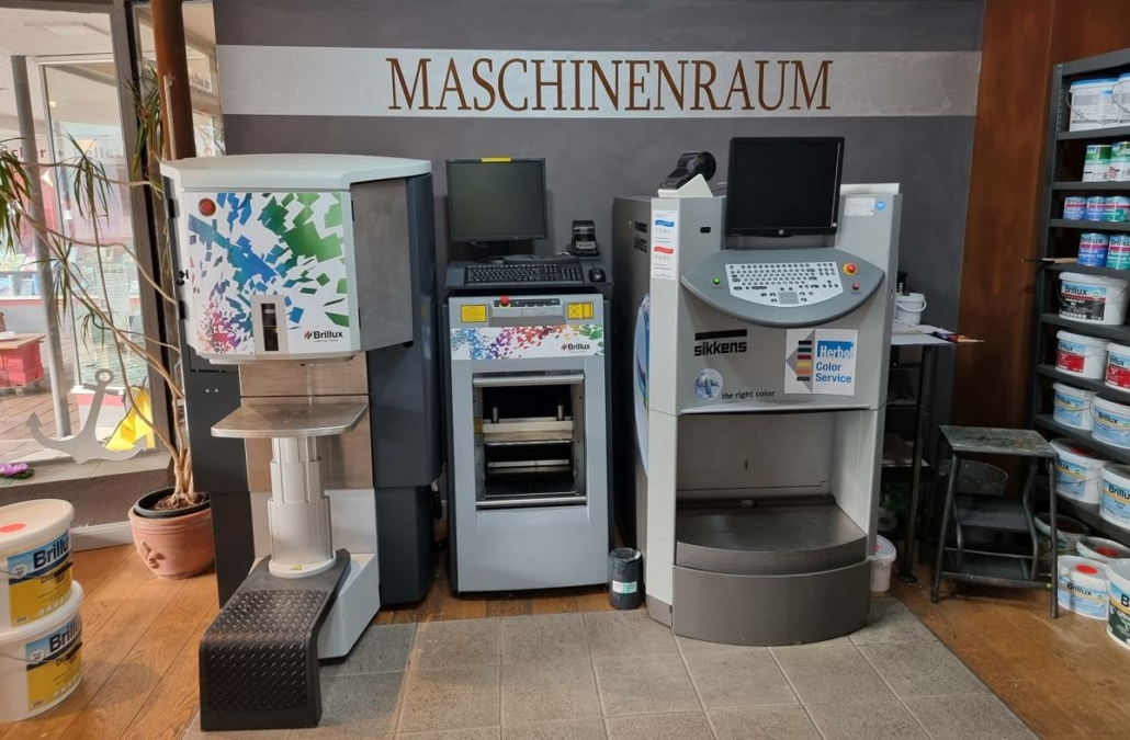 Unsere beiden Farbmischanlagen können fast jeden gewünschten Farbton innerhalb von Minuten in allen Materialien herzaubern, naja tönen und danach schütteln.